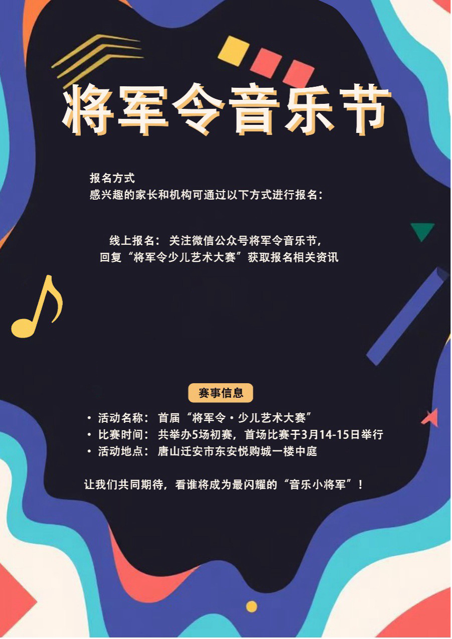 当稚嫩的童声碰撞摇滚的节奏,当小小的手指拨动古典的琴弦,一场属于少年儿童的音乐狂欢即将登陆迁安!备受期待的首届“将军令·少儿艺术大赛”初赛的首场比赛将于 3月14号 在唐山迁安东安悦购城举行。作为“将军令音乐节”的青少年特别单元,本次大赛也将展现音乐节的热血与激情,为迁安市民带来一场别开生面的少儿音乐盛会。
